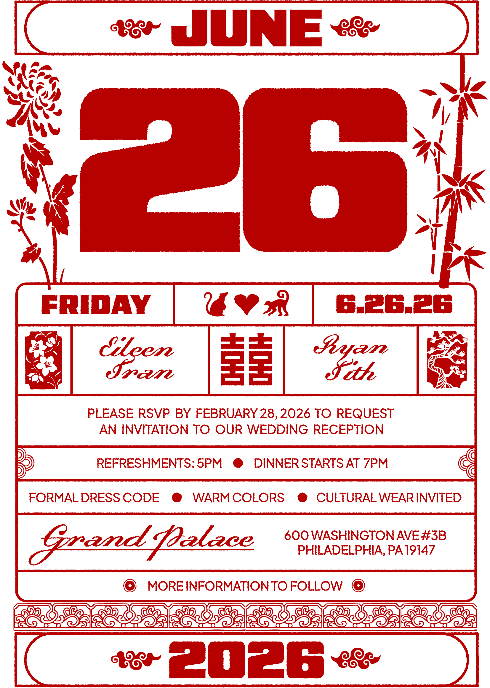 We are holding a wedding ceremony on the day of June 26, 2026 with our closest family and friends. More details to follow.